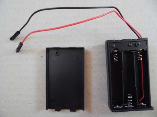 白色LEDを点灯させるには3.3〜3.6Vくらいの電圧が必要。単3充電池1.2Vの3本分くらい。なので単3の直列3ピースな電池ケースを買った。例によって銅線むきだしなのでピンコネクタ雌とハウジング(1P 2.54mm)をとりつける。