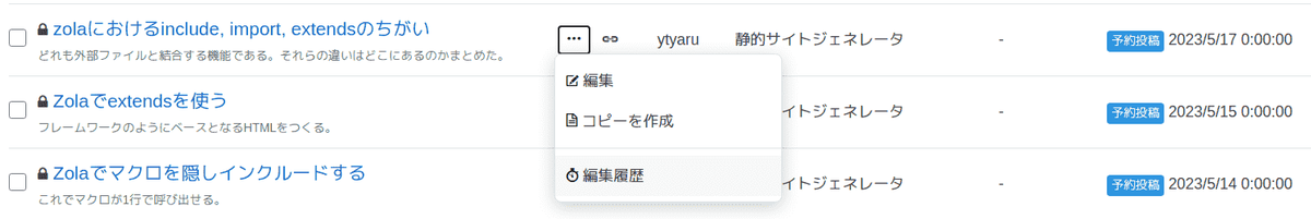 記事の管理で、戻したい記事の横にある…をクリックし、編集履歴をえらぶ。